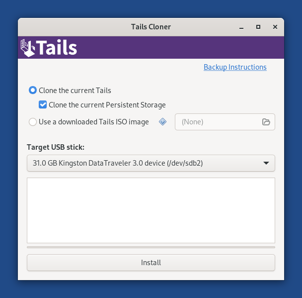 If your backup Tails has an outdated version of Tails, we recommend you upgrade it by cloning your current Tails using Tails Cloner. For detailed instructions, see how to manually upgrade from another Tails.
