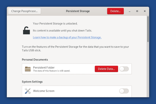 Tails 5.8 was one of the most important Tails releases in years. In Tails 5.8, we unveiled a brand new Persistent Storage. The new Persistent Storage doesn't require restarting after creation or any time after you activate a new feature. It also made it easier to persist more settings. The icing on the cake: a dashing makeover for the Persistent Storage!